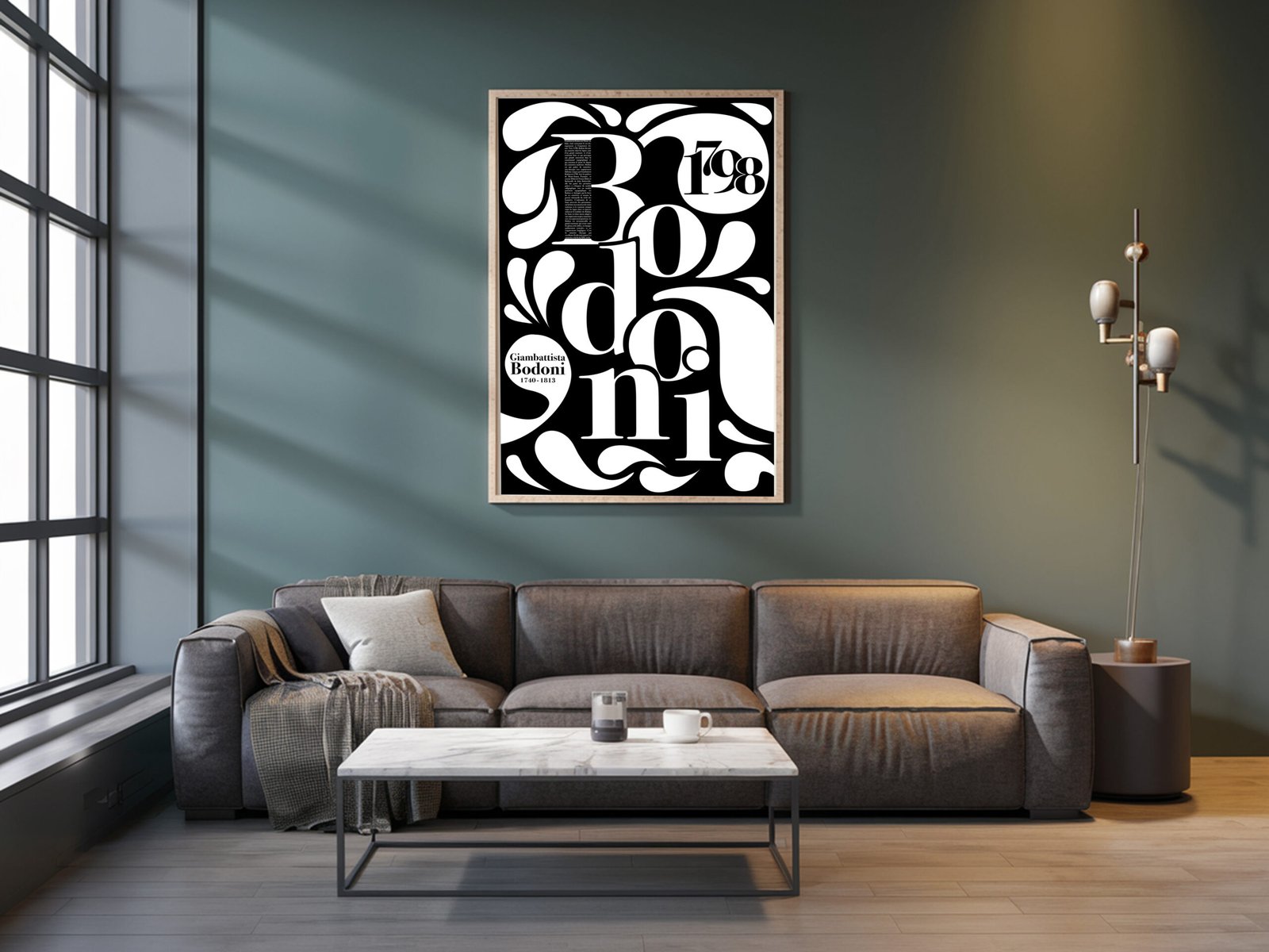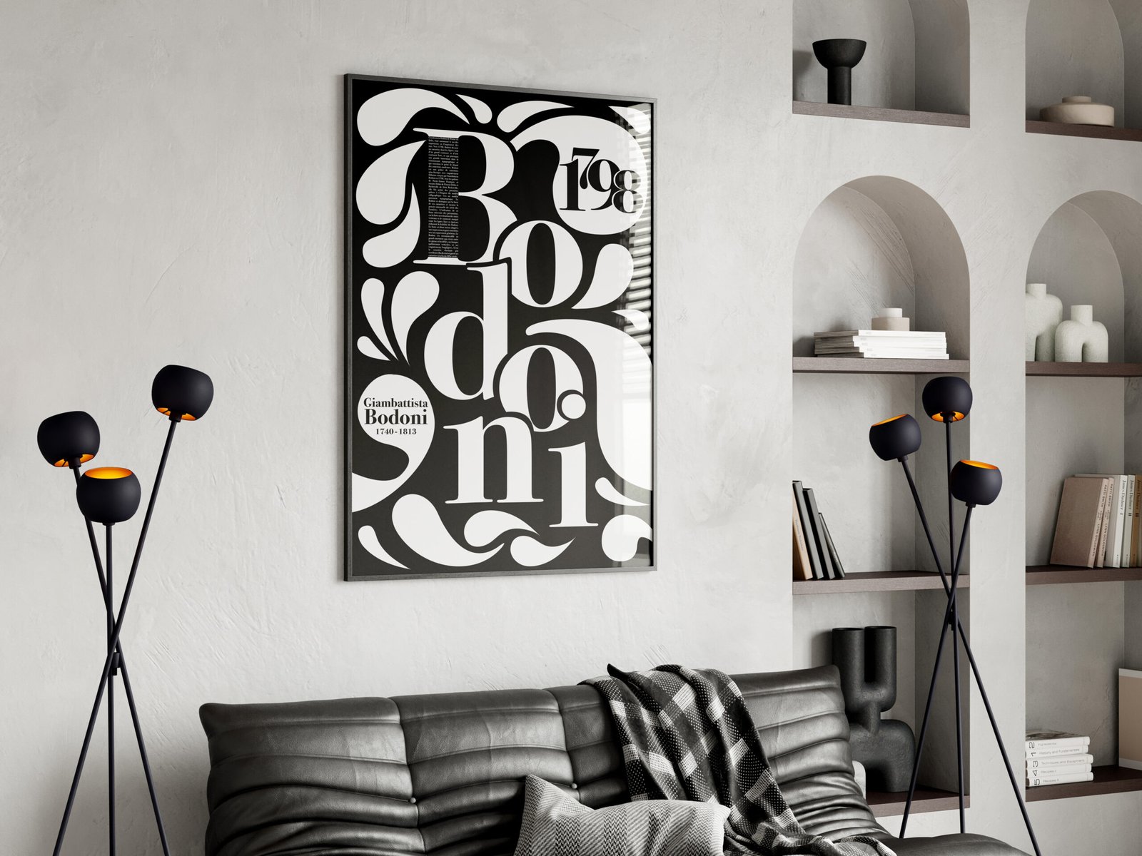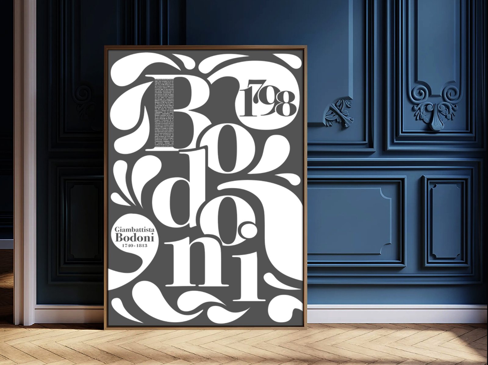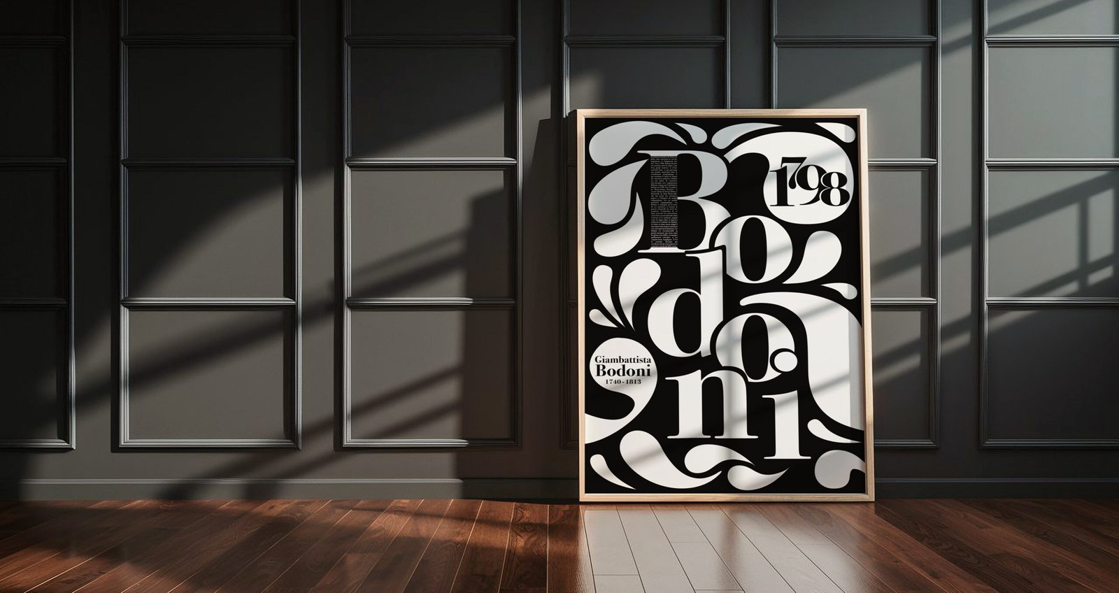 Le design s’articule autour d’une composition typographique immersive, avec le mot “Bodoni” comme élément central. Les lettres sont utilisées à grande échelle pour créer un rythme visuel dynamique et fluide, enrichi par des ornements graphiques inspirés des contrastes élégants propres de la famille Bodoni. La biographie du typographe ainsi que les dates clés sont intégrées avec soin dans les espaces négatifs, devenant des éléments visuels à part entière.
