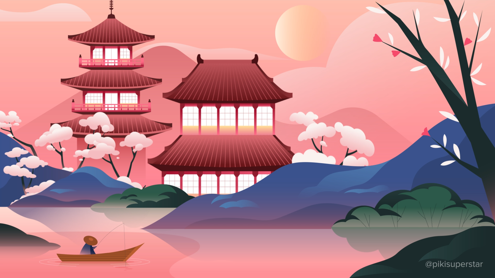 À partir d’une composition illustrée, les différents plans (paysage, pagodes, éléments naturels, personnage dans la barque) ont été séparés puis animés de façon indépendante. Le mouvement subtil de chaque calque à différentes vitesses a permis de créer l’effet de profondeur recherché. La palette de tons chauds et le style minimaliste ont renforcé l’ambiance poétique et contemplative de la scène.