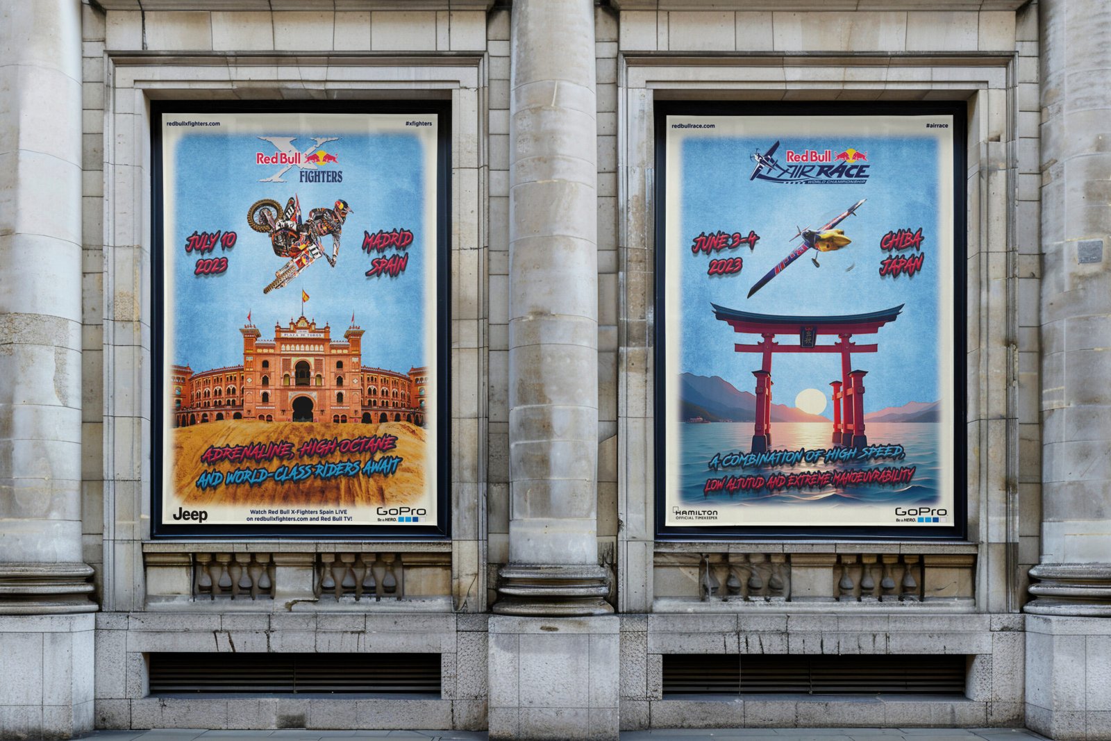 Chaque affiche capte l’attention dès le premier regard grâce à une composition verticale dynamique et à une mise en scène spectaculaire. L’arrière-plan texturé en bleu agit comme un liant visuel et émotionnel, accentuant la sensation de vitesse et de liberté. L’ensemble crée une signature visuelle forte, idéale pour une campagne extérieure, dans un contexte urbain ou événementiel, en accord parfait avec l’ADN audacieux de Red Bull.