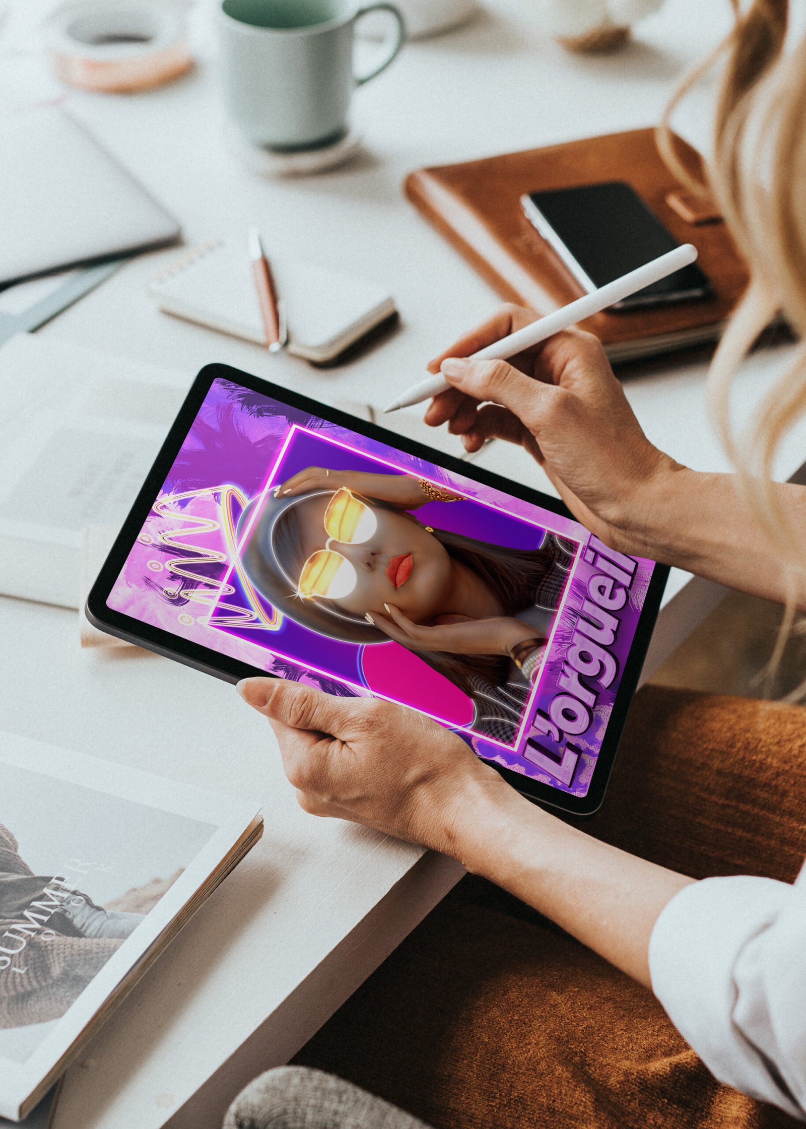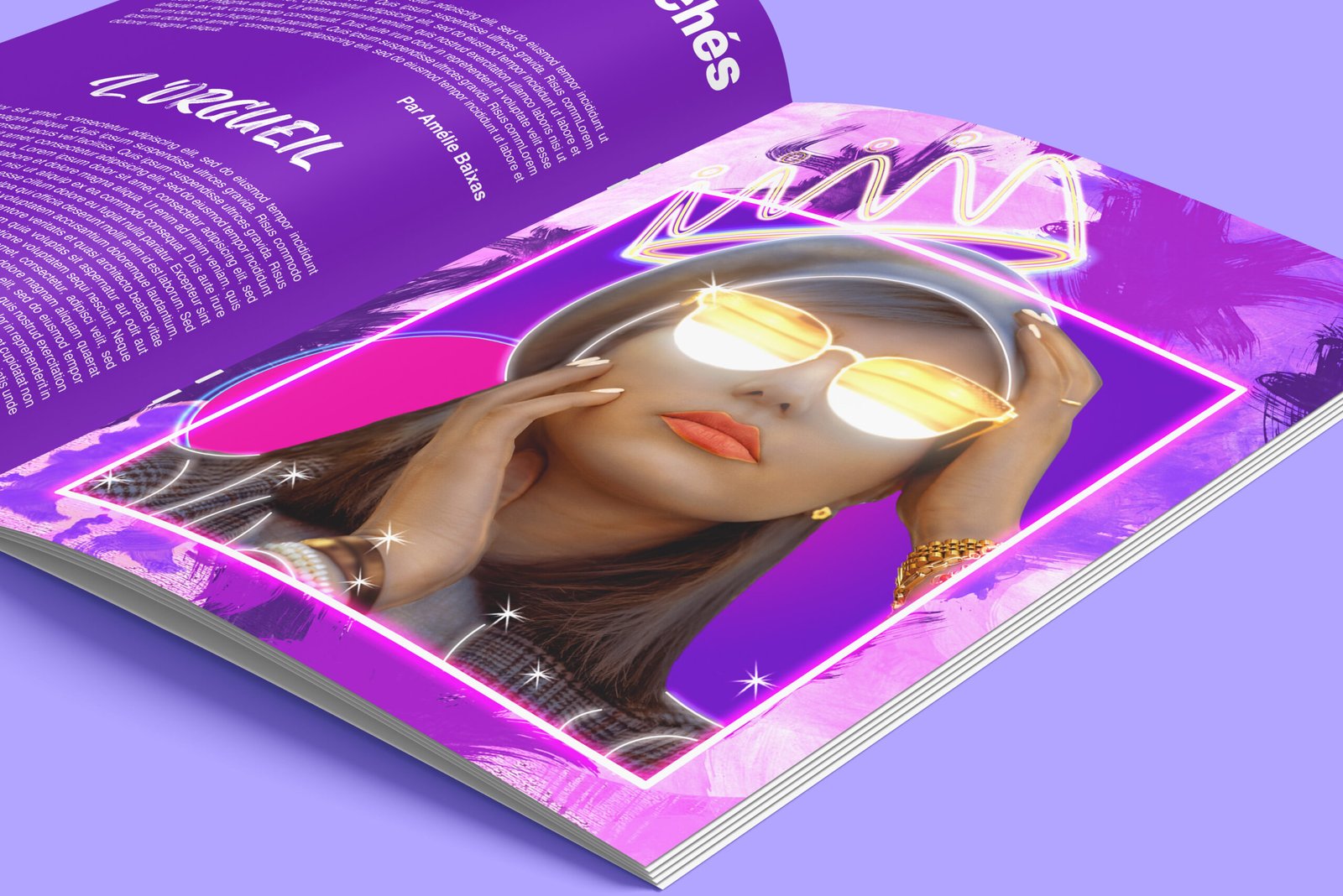 Une image photographique a servi de base, enrichie par des éléments graphiques numériques au style pop-néon : couronne lumineuse, lignes brillantes, reflets stylisés. La palette chromatique, centrée sur les violets et magentas, évoque le luxe, la sensualité et l’excès. L’orgueil est ici représenté comme une vanité sublimée, mêlant glamour superficiel et langage visuel de la culture numérique contemporaine.