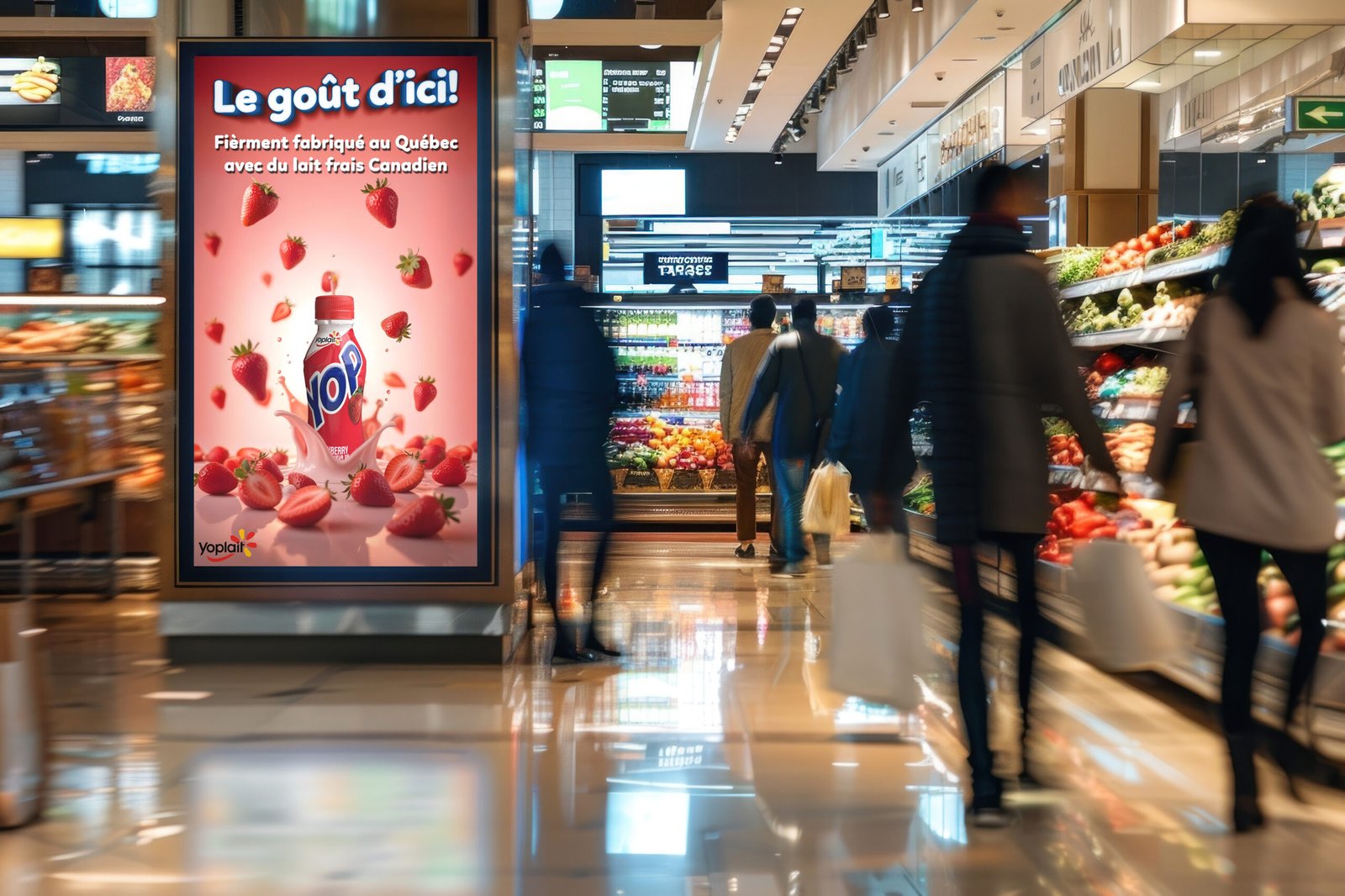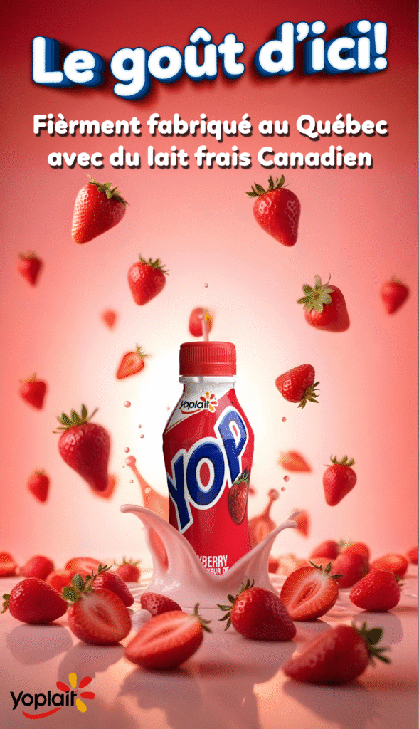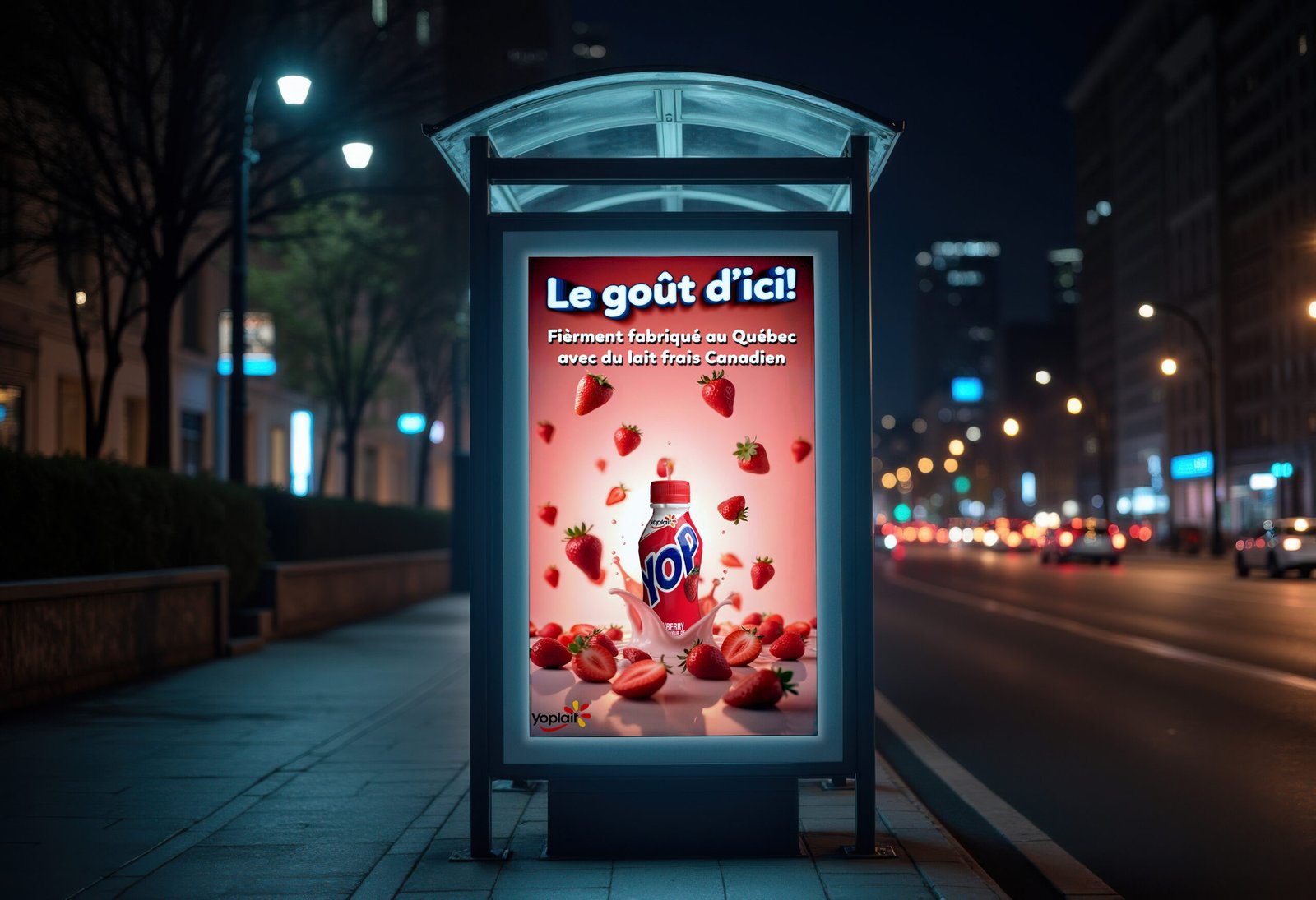 Développer une affiche publicitaire pour le YOP à la fraise (marque Yoplait) visant à mettre de l’avant son origine locale : « Le goût d’ici! ». L’objectif était de souligner que le produit est fabriqué au Québec avec du lait frais canadien, renforçant ainsi le lien émotionnel avec le consommateur local. L’affiche devait s’afficher en milieu urbain, dans les supermarchés et sur les plateformes numériques, incluant une vidéo promotionnelle.
